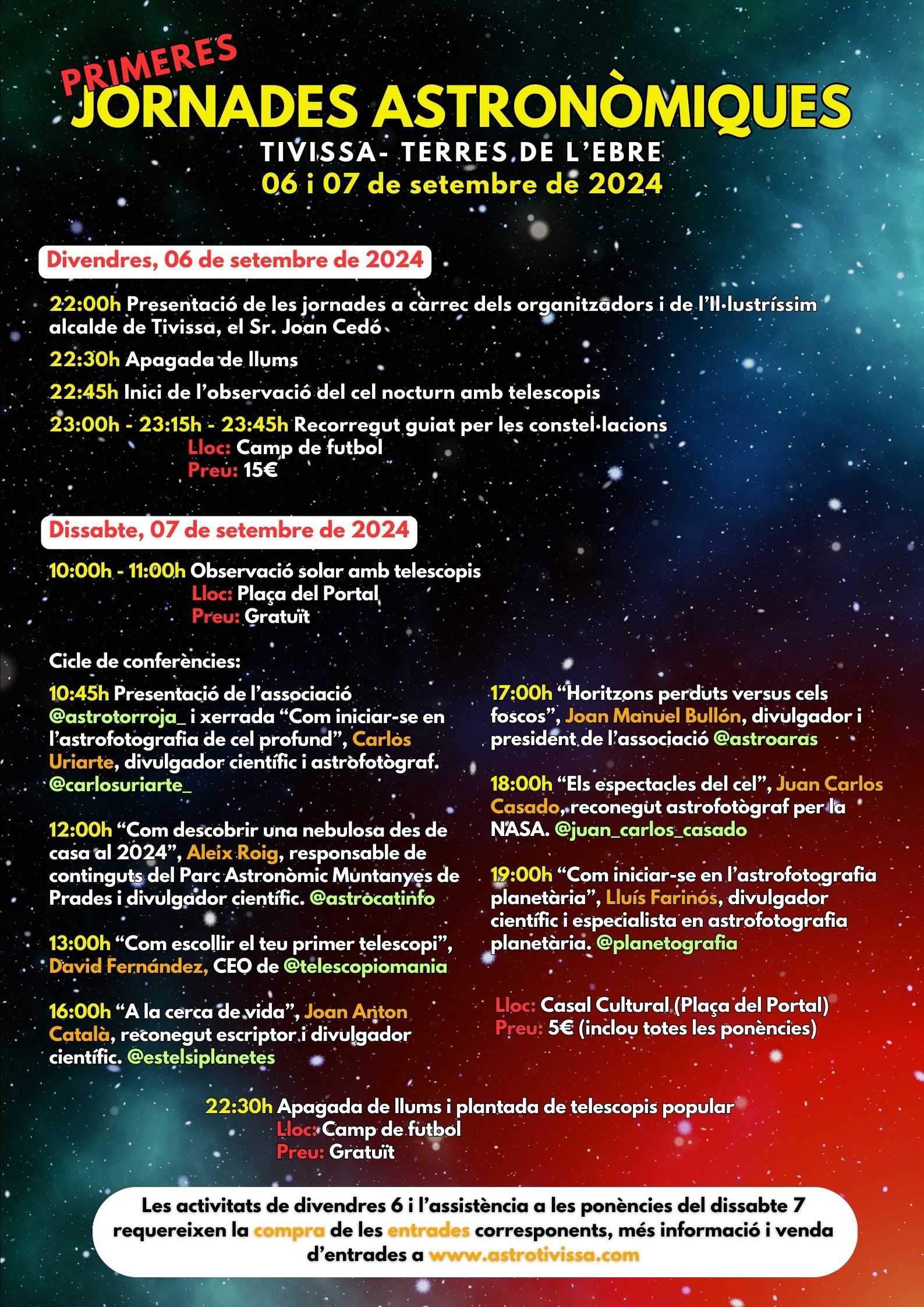El 6 y 7 de septiembre de 2024 tuvieron lugar las primeras jornadas astronómicas de Tivissa – Terres de l’Ebre. La noche del 6, donde se tenía que realizar la apagada de luces, la presentación y la observación con grandes telescopios por parte de los amigos del Parc Astronòmic Muntanyes de Prades, peligró hasta el último minuto, pues pocos minutos antes estaba todo nublado e incluso llegó a llover. Esa semana estuvo marcada por mucha inestabilidad climática, pero aún así y contra todas las previsiones, a la hora indicada, el cielo se abrió lo suficiente para poder mostrarnos esa vía láctea, dejarnos presentar las jornadas con su carácter reinvindicativo para concienciar sobre la contaminación lumínica, y permitiendo que Saturno, en oposición esos días, fuera observable por todos con los grandes telescopios. Las palabras «espectacular» e «inolvidable» fueron recurrentes entre los asistentes.